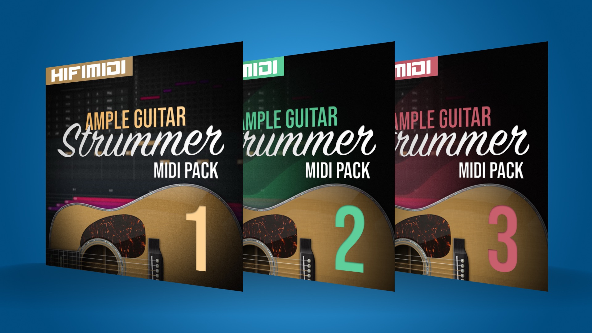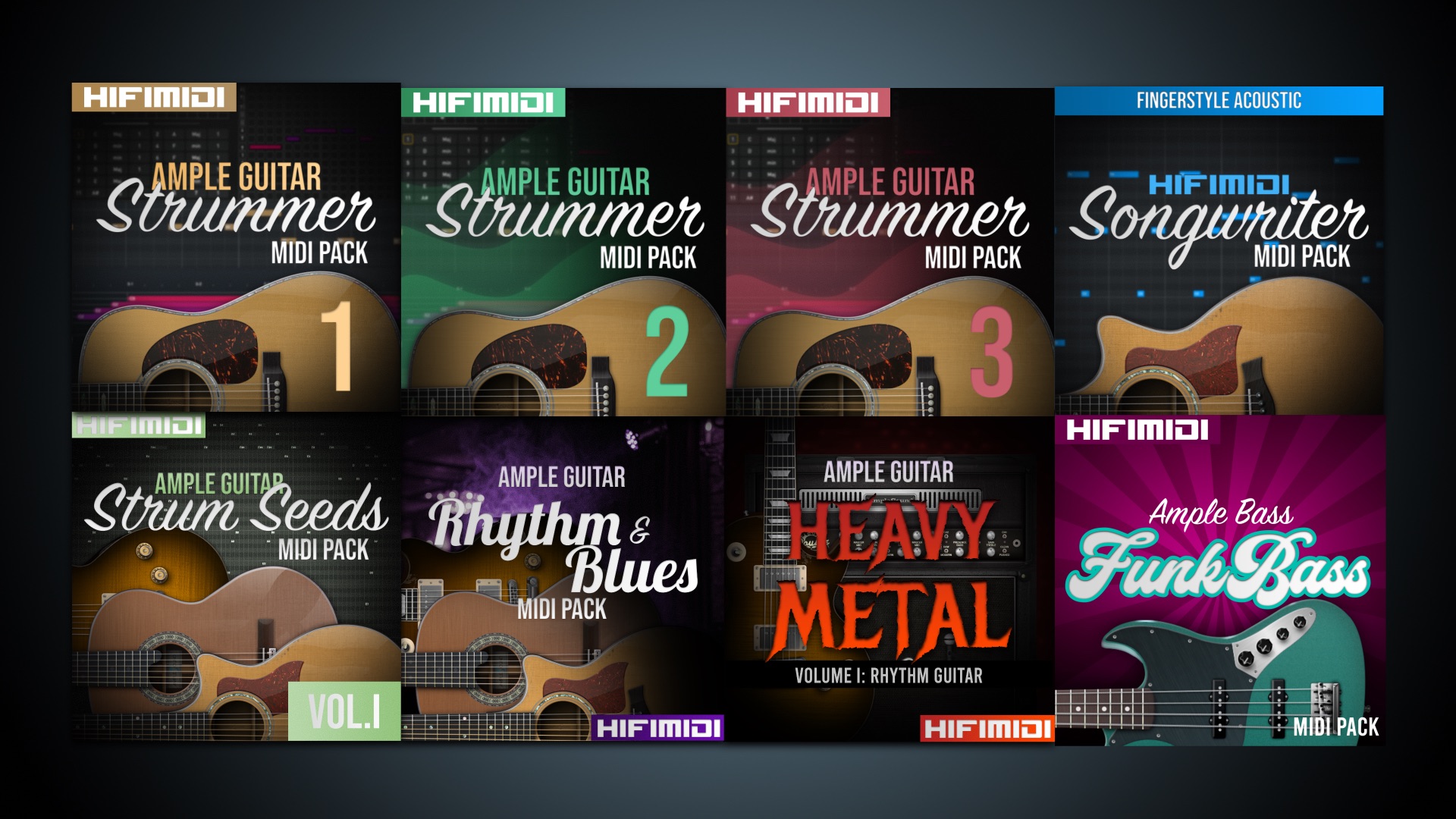 200 MIDI files ofย 50 chord progressions, 3 playing styles, and 4/4 & 3/4 meter for any guitar sample library.