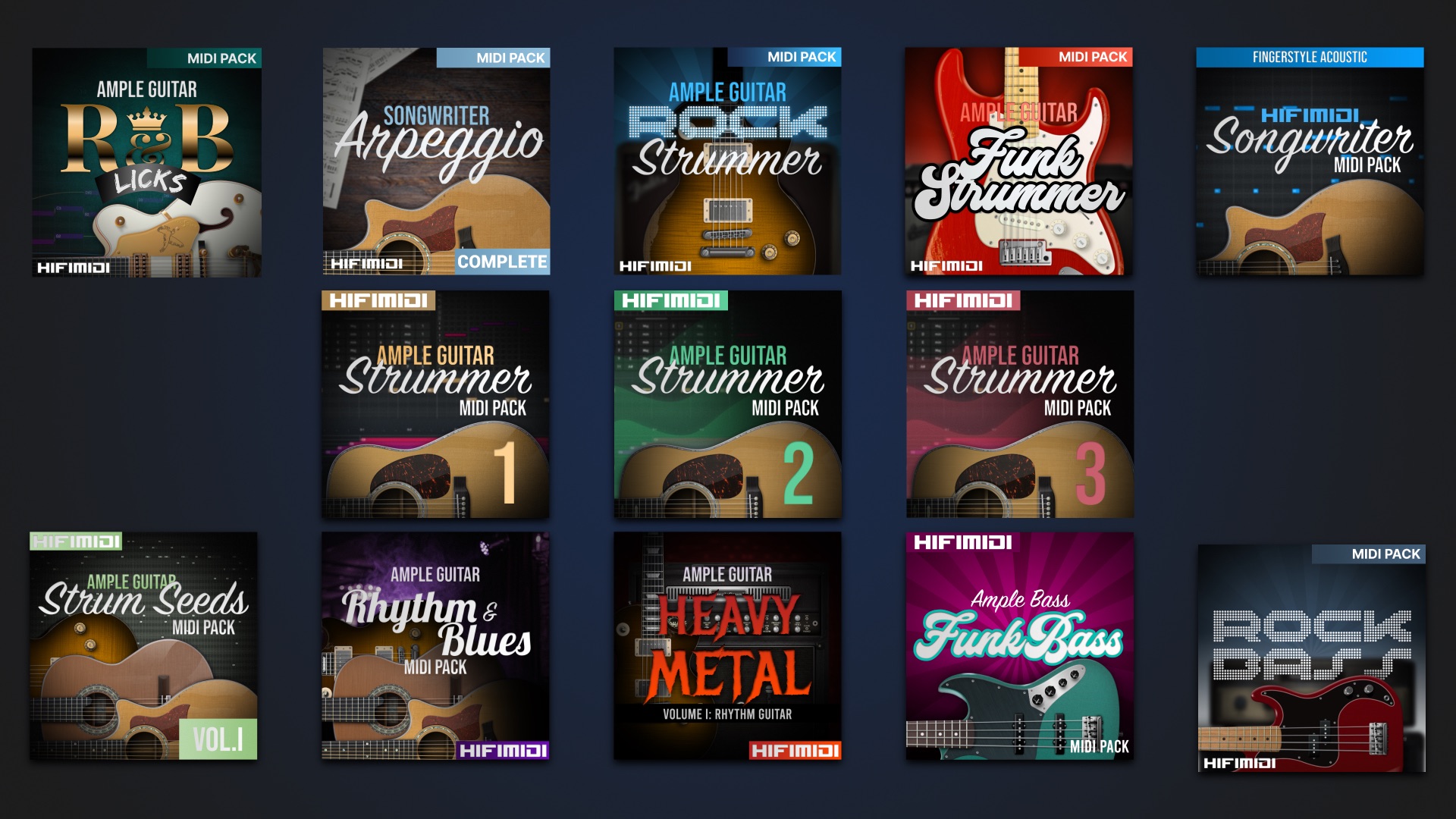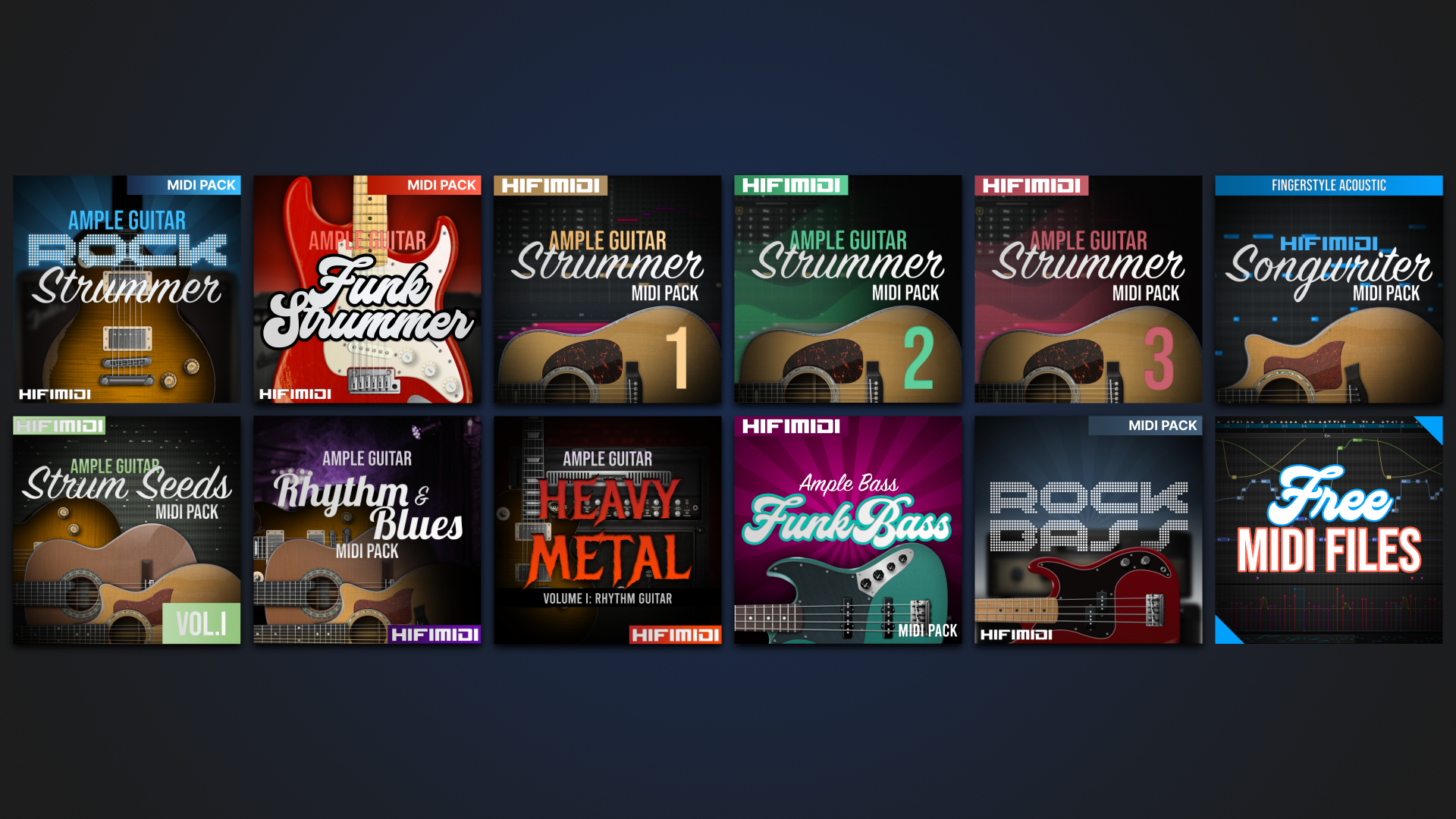 200 MIDI files ofย 50 chord progressions, 3 playing styles, and 4/4 & 3/4 meter for any guitar sample library.